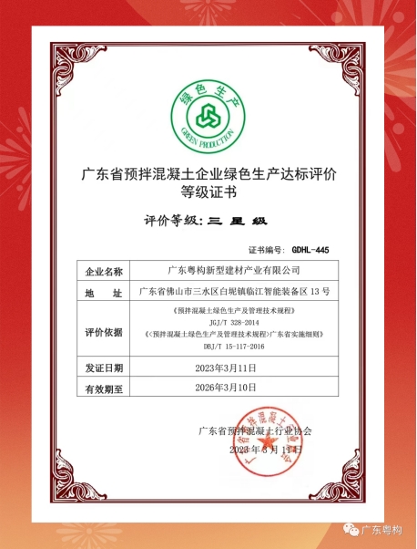 3月11日,经广东省预拌混凝土行业协会、佛山市住房和城乡建设局及佛山市建筑业协会专家组现场考察审定通过,广东粤构新型建材产业有限公司正式评定为“绿色生产三星级达标企业”,颁发《广东省预拌混凝土企业绿色生产达标评价等级证书》。