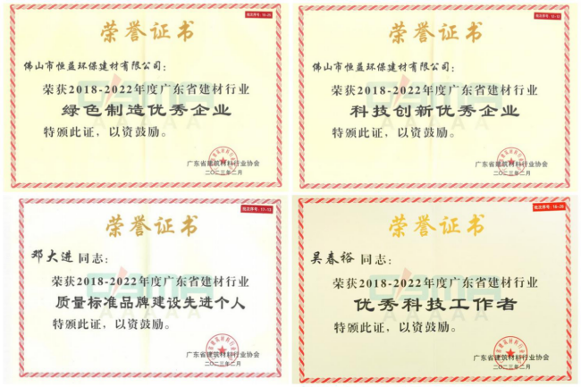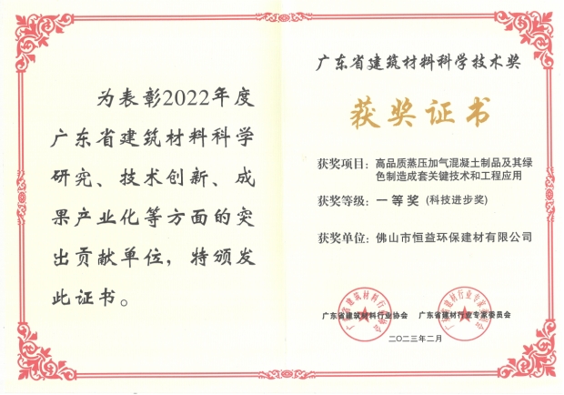近日,广东省建材行业高质量发展会暨广东省建筑材料行业协会第五届一次会员大会在佛山举行。恒益环保建材公司项目成果“高品质蒸压加气混凝土制品及其绿色制造成套关键技术和工程应用”被授予“广东省建筑材料科学技术奖一等奖”称号!与此同时,还获得了“绿色制造优秀企业”“科技创新优秀企业”“质量标准品牌建设先进个人”等多项集体及个人荣誉。