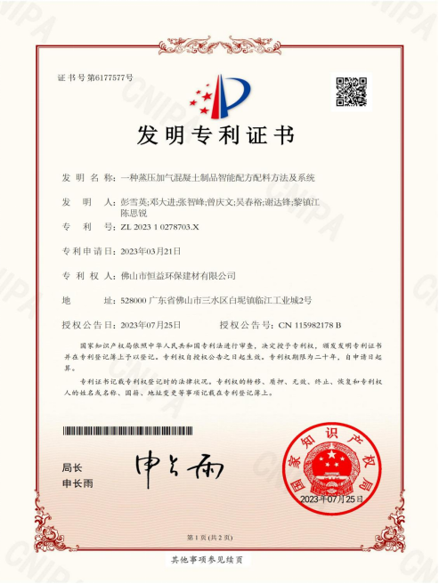 通过多年来的努力,恒益环保建材公司的专利件数日益增多。这些专利成果为公司今后的发展积蓄了前进的动力,进一步提升了产品的科技含量。下一步,公司将继续加强专利技术成果的推广应用和创新创效,以自主知识产权优势促进技术创新,不断提高核心竞争力,为推动加气行业高质量发展做出新的贡献。(环保建材 吴丽珊)