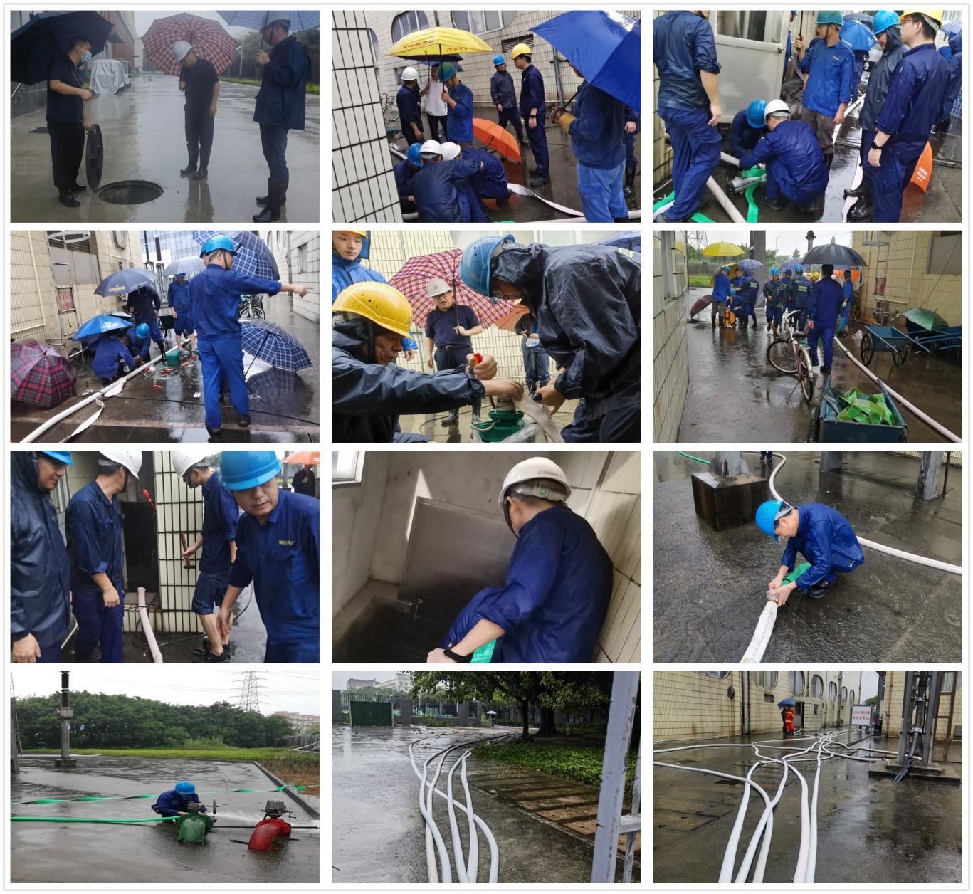 然而,面对110KV升压站和220KV升压站地下室的大面积和高水量的挑战,仅靠这8台潜水泵无法有效阻止雨水的汇入。在厂部领导的调度下,一方面再次调配了4台大功率的潜水泵加入排涝工作,并把所有的潜水泵出口排放管接驳到几十米远的南边道路排放井内,大大提高了排水效率;另一方面积极协调开普勒公司区域的排涝工作,要求他们立即安装潜水泵将园区堵塞管沟的雨水尽快排到有排放能力的排放井,以减轻他们园区雨水对福能电厂升压站的倒灌压力。